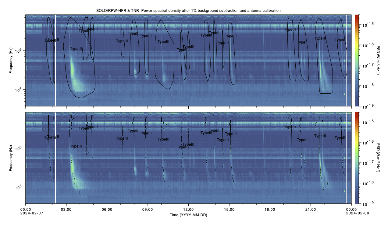 The following Figure displays a typical 24-hour dynamic spectra of Solar Orbiter / RPW (TNF, HFR) data with the catalogued emissions.